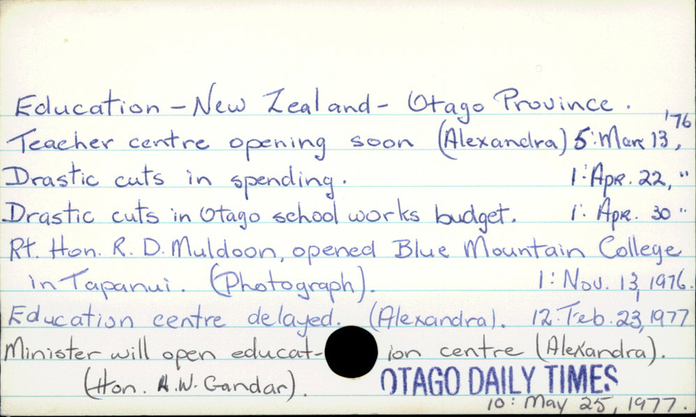Dunedin Public Libraries (4th Oct 2019). Education - New Zealand - Otago Province. In Website Dunedin Public Libraries. Retrieved 27th Mar 2026 18:12, from https://dunedin.recollect.co.nz/nodes/view/127250