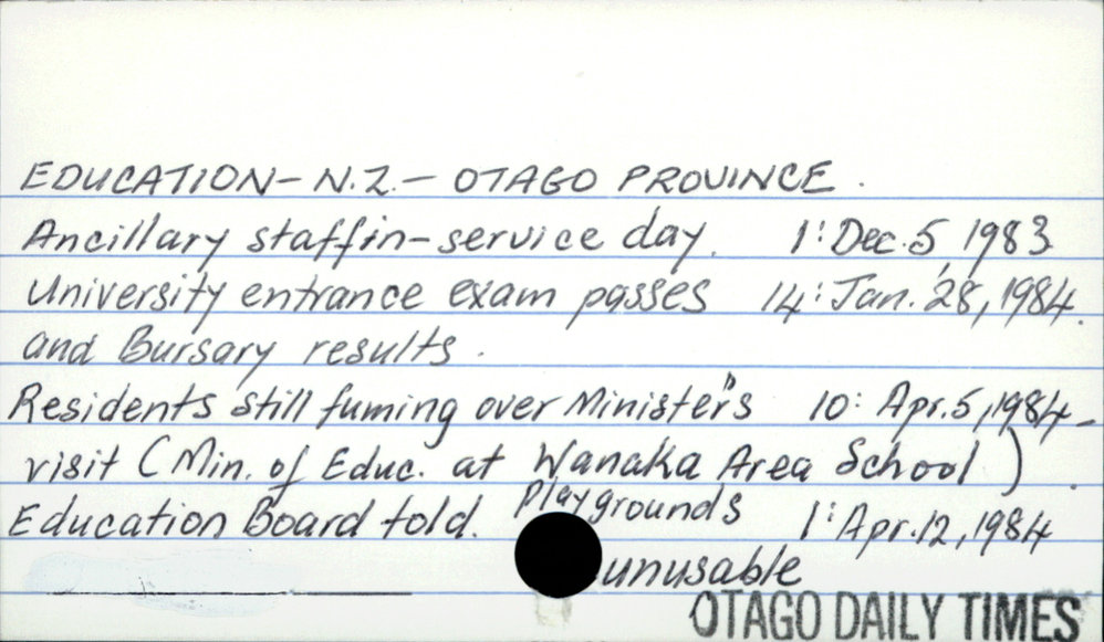 Dunedin Public Libraries (17th Oct 2019). Education - New Zealand - Otago Province. In Website Dunedin Public Libraries. Retrieved 27th Mar 2026 18:12, from https://dunedin.recollect.co.nz/nodes/view/127255