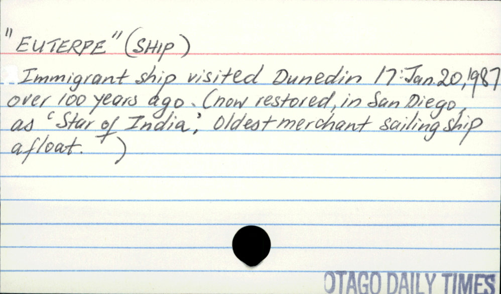 Dunedin Public Libraries (6th Nov 2019). "EUTERPE" (SHIP). In Website Dunedin Public Libraries. Retrieved 27th Mar 2026 10:33, from https://dunedin.recollect.co.nz/nodes/view/129780