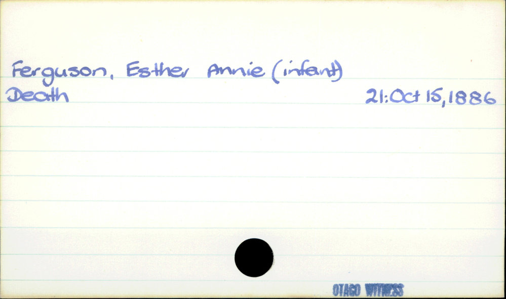 Dunedin Public Libraries (28th Nov 2019). Ferguson, Esther Annie (infant). In Website Dunedin Public Libraries. Retrieved 27th Mar 2026 10:56, from https://dunedin.recollect.co.nz/nodes/view/131512