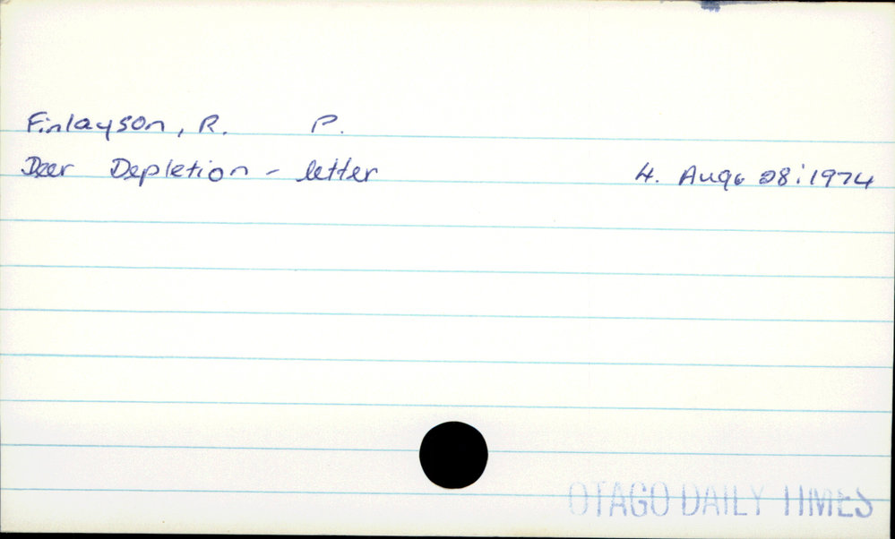 Dunedin Public Libraries (6th Dec 2019). Finlayson, R.P.. In Website Dunedin Public Libraries. Retrieved 27th Mar 2026 10:49, from https://dunedin.recollect.co.nz/nodes/view/132358