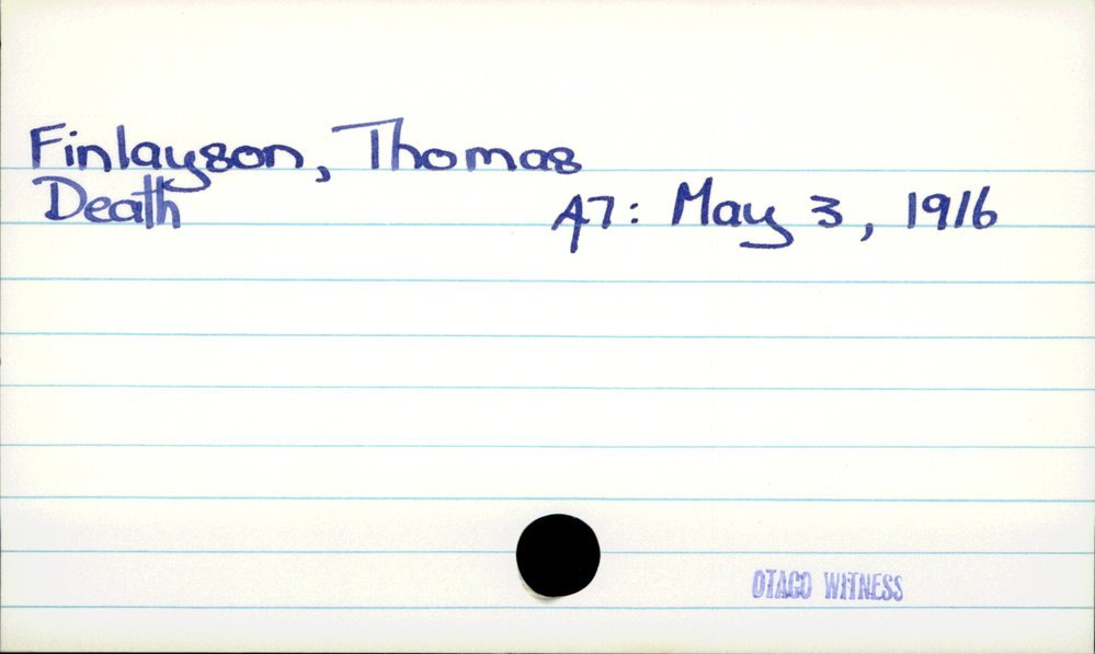 Dunedin Public Libraries (6th Dec 2019). Finlayson, Thomas. In Website Dunedin Public Libraries. Retrieved 27th Mar 2026 10:56, from https://dunedin.recollect.co.nz/nodes/view/132361