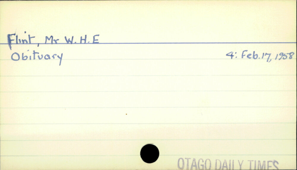 Dunedin Public Libraries (28th Dec 2019). Flint, Mr W. H. E.. In Website Dunedin Public Libraries. Retrieved 27th Mar 2026 10:49, from https://dunedin.recollect.co.nz/nodes/view/133947