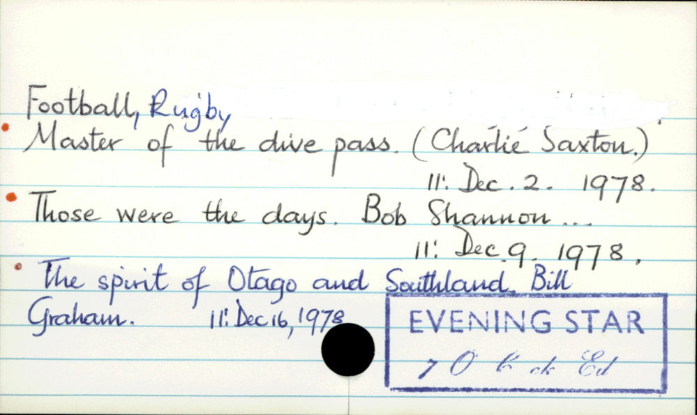 Dunedin Public Libraries (11th Jan 2020). Football, Rugby. In Website Dunedin Public Libraries. Retrieved 27th Mar 2026 09:08, from https://dunedin.recollect.co.nz/nodes/view/134717