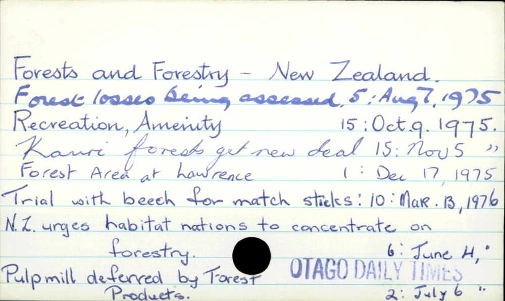 Dunedin Public Libraries (21st Jan 2020). Forests and Forestry - New Zealand. In Website Dunedin Public Libraries. Retrieved 1st Apr 2026 20:37, from https://dunedin.recollect.co.nz/nodes/view/135217