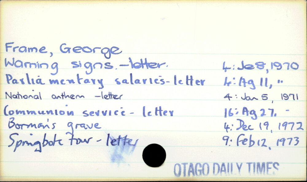 Dunedin Public Libraries (27th Jan 2020). Frame, George. In Website Dunedin Public Libraries. Retrieved 1st Apr 2026 22:48, from https://dunedin.recollect.co.nz/nodes/view/135763