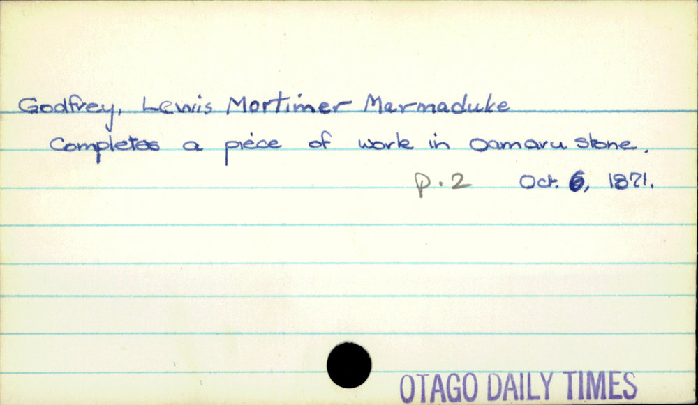 Dunedin Public Libraries (28th Mar 2020). Godfrey, Lewis Mortimer Marmaduke. In Website Dunedin Public Libraries. Retrieved 9th Apr 2026 18:08, from https://dunedin.recollect.co.nz/nodes/view/139765
