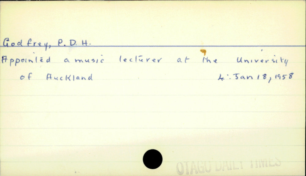Dunedin Public Libraries (28th Mar 2020). Godfrey, P. D. H.. In Website Dunedin Public Libraries. Retrieved 9th Apr 2026 18:08, from https://dunedin.recollect.co.nz/nodes/view/139769
