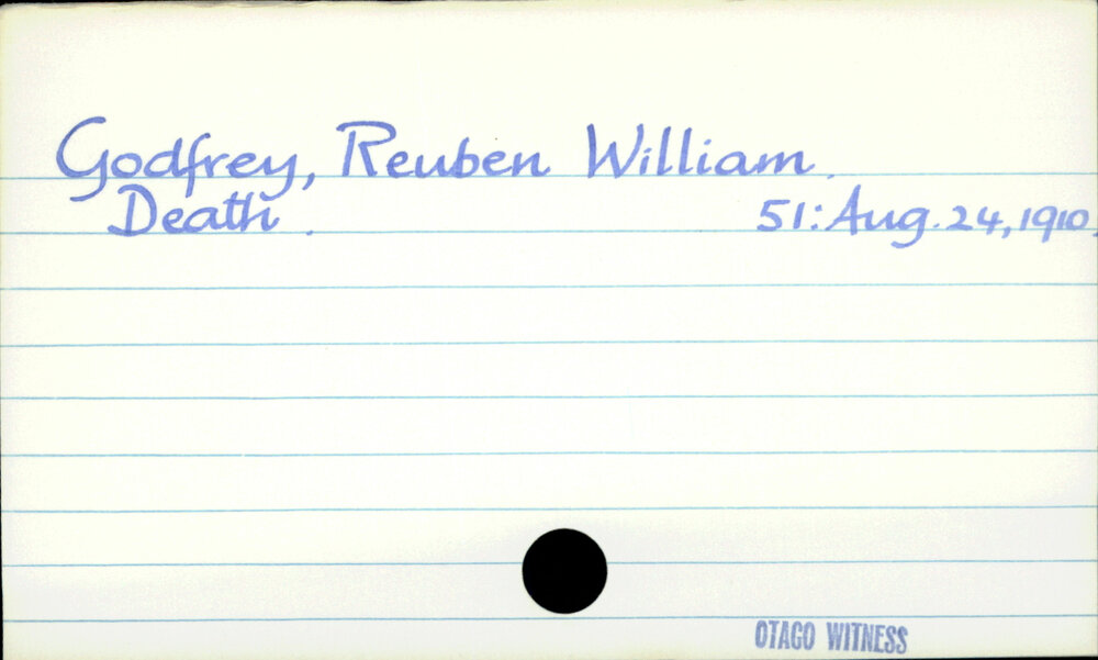Dunedin Public Libraries (28th Mar 2020). Godfrey, Reuben William. In Website Dunedin Public Libraries. Retrieved 9th Apr 2026 18:04, from https://dunedin.recollect.co.nz/nodes/view/139771