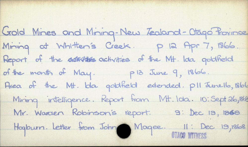 Dunedin Public Libraries (3rd Apr 2020). Gold Mines and Mining - New Zealand - Otago Province. In Website Dunedin Public Libraries. Retrieved 27th Mar 2026 14:16, from https://dunedin.recollect.co.nz/nodes/view/140621