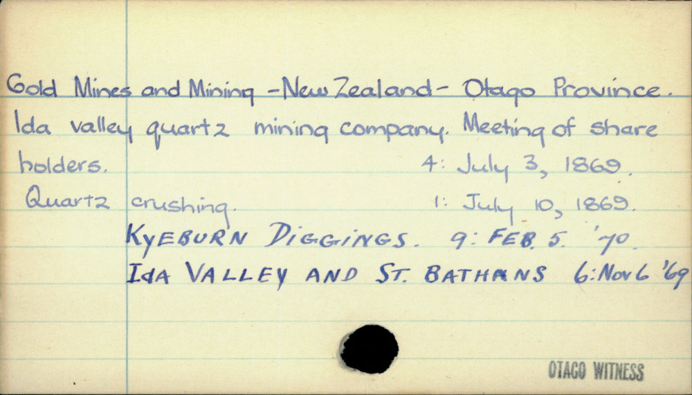 Dunedin Public Libraries (3rd Apr 2020). Gold Mines and Mining - New Zealand - Otago Province. In Website Dunedin Public Libraries. Retrieved 27th Mar 2026 14:16, from https://dunedin.recollect.co.nz/nodes/view/140624