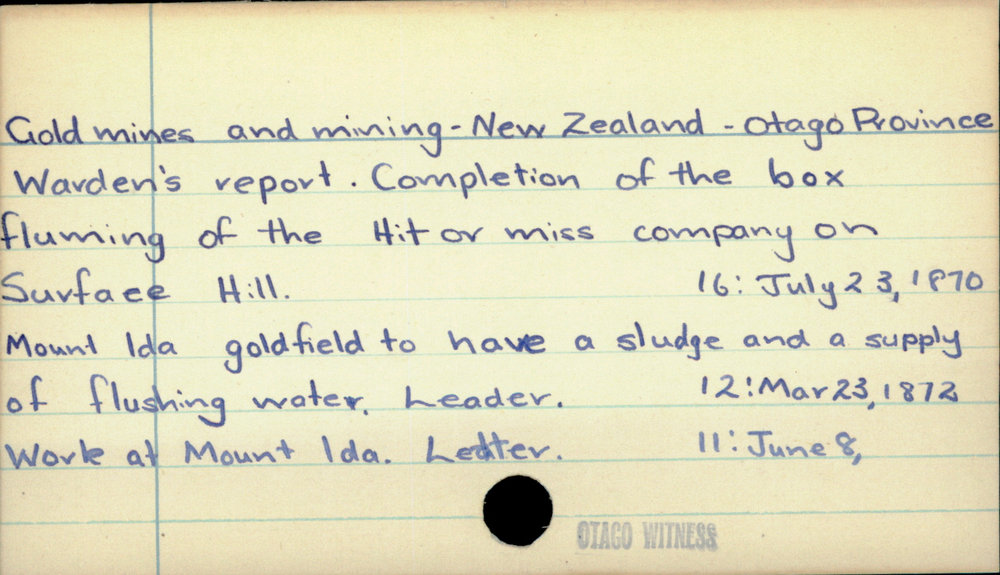 Dunedin Public Libraries (6th Apr 2020). Gold mines and mining - New Zealand - Otago Province. In Website Dunedin Public Libraries. Retrieved 27th Mar 2026 14:16, from https://dunedin.recollect.co.nz/nodes/view/140627
