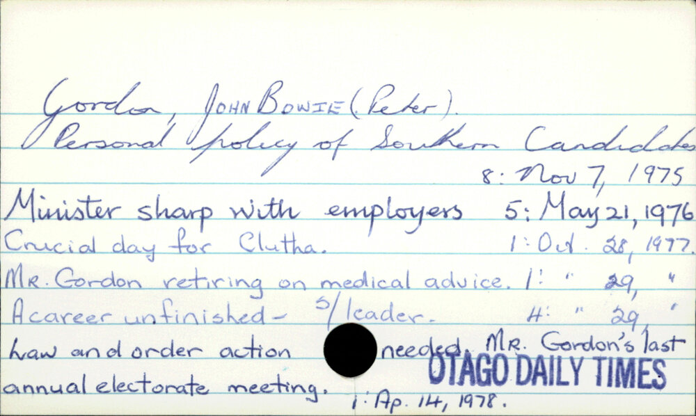 Dunedin Public Libraries (7th Apr 2020). Gordon, John Bowie (Peter). In Website Dunedin Public Libraries. Retrieved 27th Mar 2026 14:06, from https://dunedin.recollect.co.nz/nodes/view/141392
