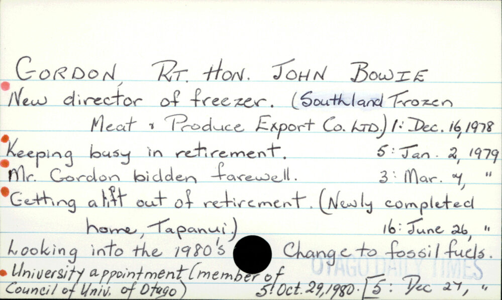 Dunedin Public Libraries (8th Apr 2020). Gordon, Rt. Hon. John Bowie. In Website Dunedin Public Libraries. Retrieved 27th Mar 2026 14:06, from https://dunedin.recollect.co.nz/nodes/view/141395