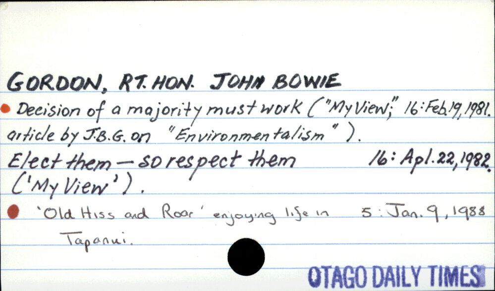 Dunedin Public Libraries (7th Apr 2020). Gordon, Rt. Hon. John Bowie. In Website Dunedin Public Libraries. Retrieved 27th Mar 2026 14:12, from https://dunedin.recollect.co.nz/nodes/view/141396