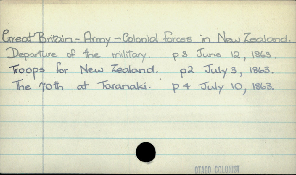 Dunedin Public Libraries (14th Apr 2020). Great Britain - Army - Colonial Forces in New Zealand. In Website Dunedin Public Libraries. Retrieved 27th Mar 2026 16:09, from https://dunedin.recollect.co.nz/nodes/view/142871
