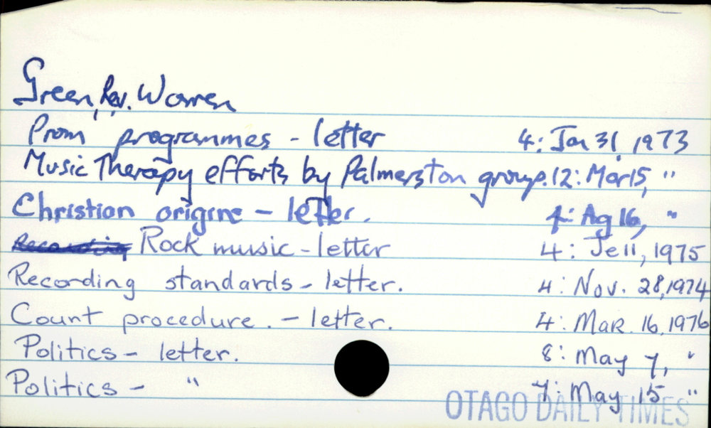 Dunedin Public Libraries (14th Apr 2020). Green, Rev. Warren. In Website Dunedin Public Libraries. Retrieved 27th Mar 2026 18:11, from https://dunedin.recollect.co.nz/nodes/view/143061