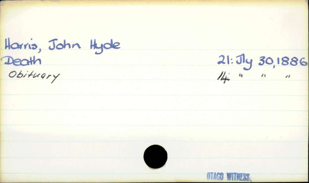 Dunedin Public Libraries (24th Apr 2020). Harris, John Hyde. In Website Dunedin Public Libraries. Retrieved 27th Mar 2026 18:12, from https://dunedin.recollect.co.nz/nodes/view/146397