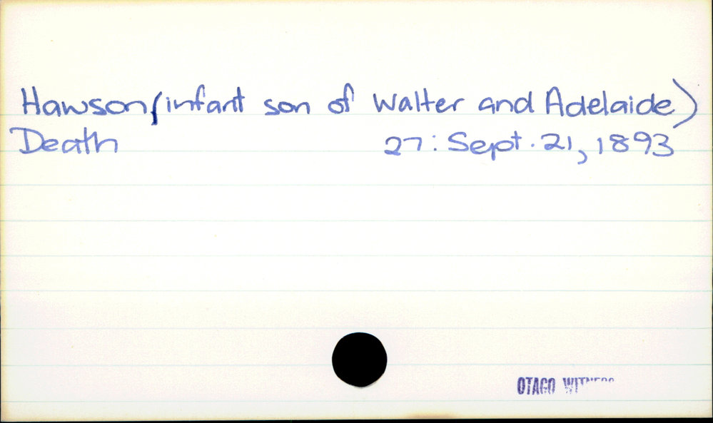 Dunedin Public Libraries (28th Apr 2020). Hawson (infant son of Walter and Adelaide). In Website Dunedin Public Libraries. Retrieved 27th Mar 2026 10:48, from https://dunedin.recollect.co.nz/nodes/view/147249