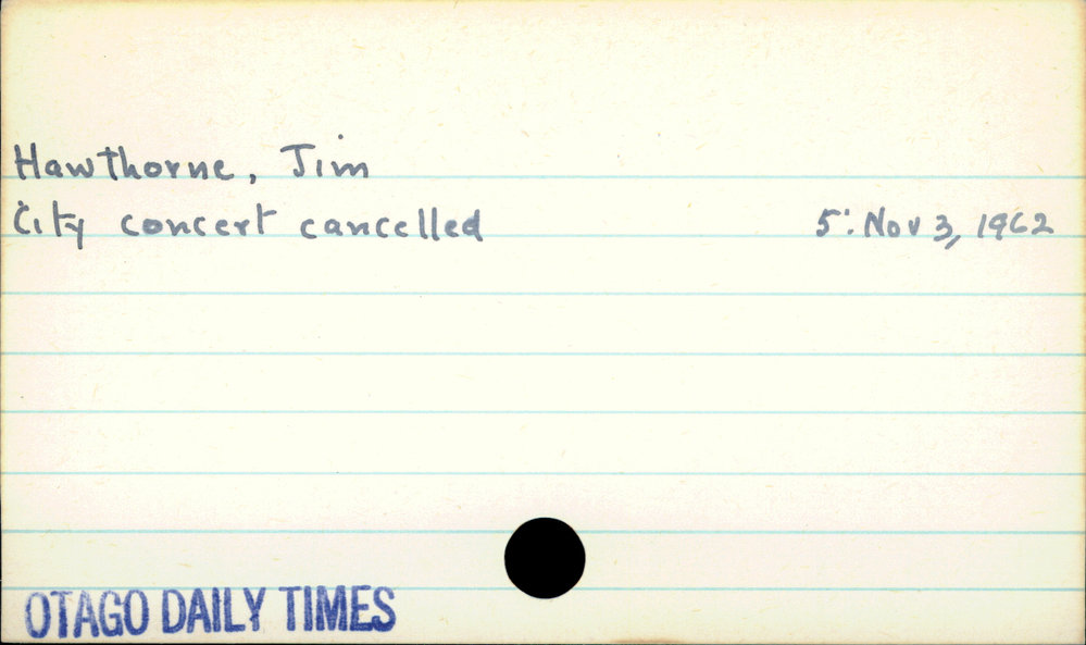 Dunedin Public Libraries (29th Apr 2020). Hawthorne, Jim. In Website Dunedin Public Libraries. Retrieved 27th Mar 2026 10:48, from https://dunedin.recollect.co.nz/nodes/view/147264