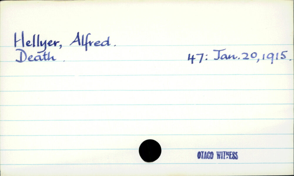 Dunedin Public Libraries (2nd May 2020). Hellyer, Alfred. In Website Dunedin Public Libraries. Retrieved 27th Mar 2026 10:37, from https://dunedin.recollect.co.nz/nodes/view/148038