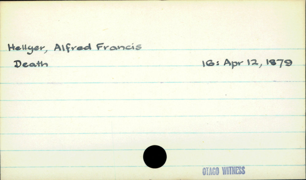 Dunedin Public Libraries (2nd May 2020). Hellyer, Alfred Francis. In Website Dunedin Public Libraries. Retrieved 27th Mar 2026 10:37, from https://dunedin.recollect.co.nz/nodes/view/148039