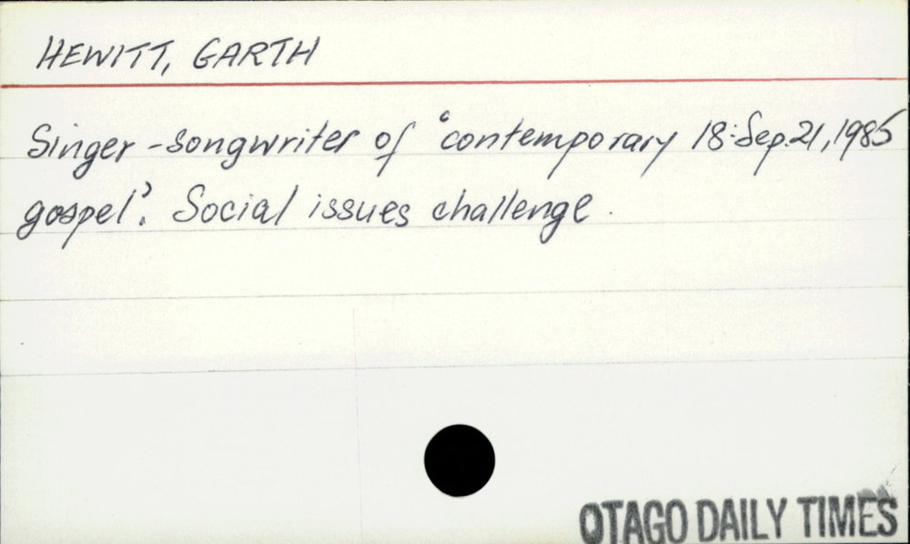 Dunedin Public Libraries (12th May 2020). Hewitt, Garth. In Website Dunedin Public Libraries. Retrieved 27th Mar 2026 10:53, from https://dunedin.recollect.co.nz/nodes/view/148894