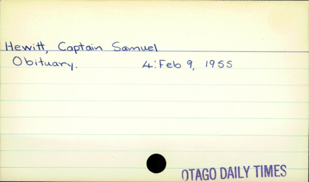 Dunedin Public Libraries (12th May 2020). Hewitt, Captain Samuel. In Website Dunedin Public Libraries. Retrieved 27th Mar 2026 10:53, from https://dunedin.recollect.co.nz/nodes/view/148908
