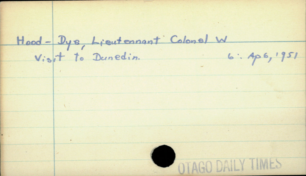 Dunedin Public Libraries (21st May 2020). Hood-Dye, Lieutenant Colonel W. In Website Dunedin Public Libraries. Retrieved 27th Mar 2026 10:35, from https://dunedin.recollect.co.nz/nodes/view/151109