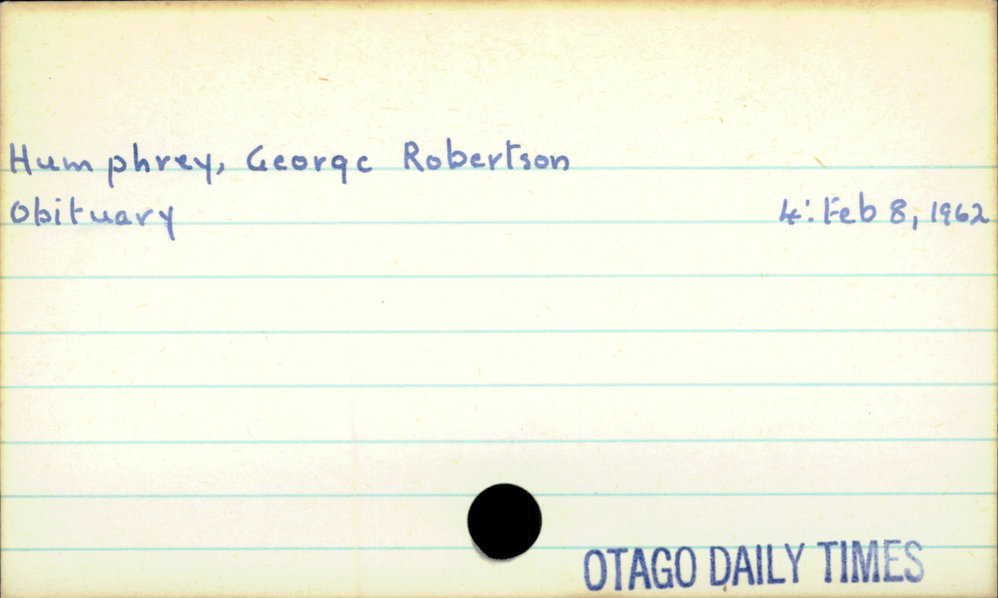 Dunedin Public Libraries (10th Jun 2020). Humphrey, George Robertson. In Website Dunedin Public Libraries. Retrieved 27th Mar 2026 07:14, from https://dunedin.recollect.co.nz/nodes/view/153480
