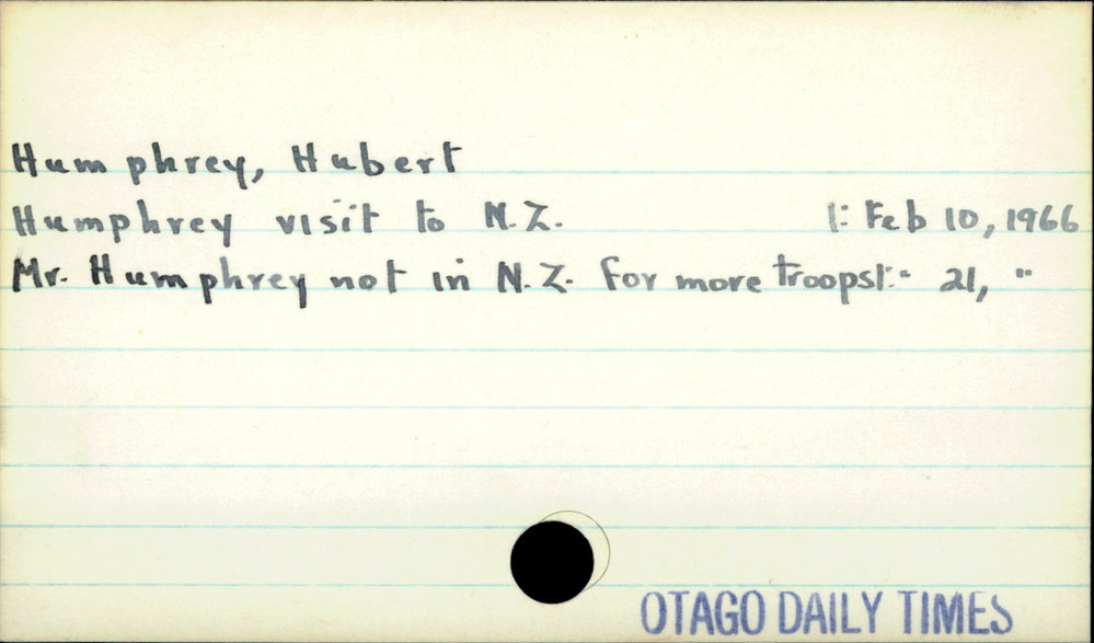Dunedin Public Libraries (23rd Jun 2020). Humphery, Hubert. In Website Dunedin Public Libraries. Retrieved 27th Mar 2026 07:15, from https://dunedin.recollect.co.nz/nodes/view/153481