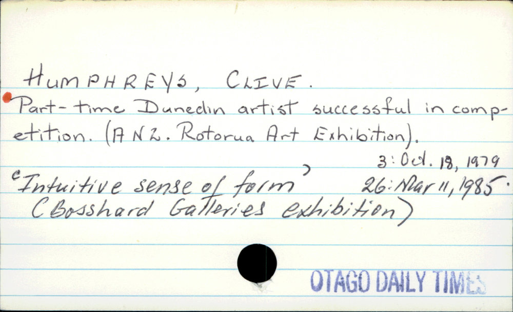 Dunedin Public Libraries (10th Jun 2020). Humphreys, Clive. In Website Dunedin Public Libraries. Retrieved 27th Mar 2026 07:14, from https://dunedin.recollect.co.nz/nodes/view/153489