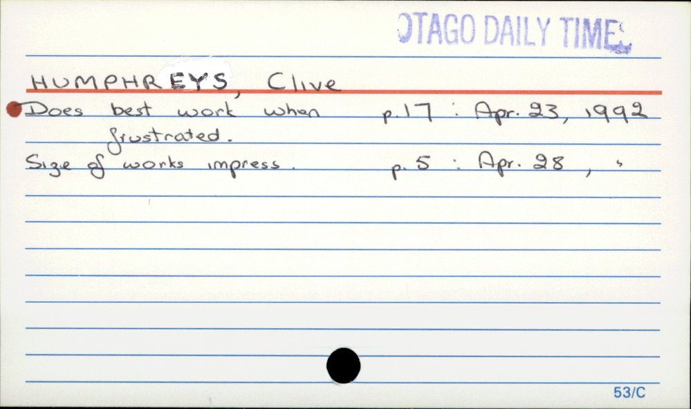 Dunedin Public Libraries (16th Jun 2020). Humphreys, Clive. In Website Dunedin Public Libraries. Retrieved 27th Mar 2026 07:15, from https://dunedin.recollect.co.nz/nodes/view/153491