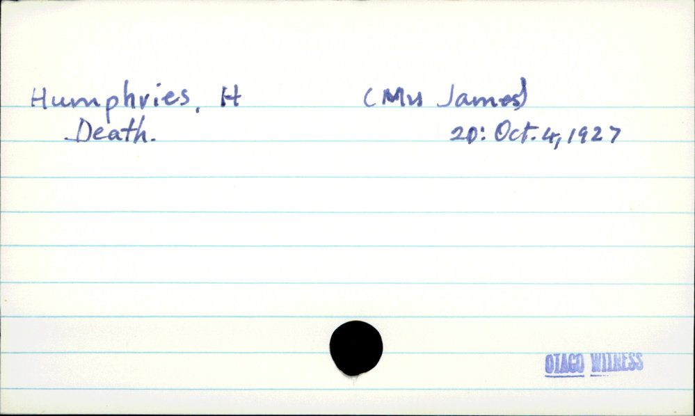 Dunedin Public Libraries (10th Jun 2020). Humphries, H (Mrs James). In Website Dunedin Public Libraries. Retrieved 27th Mar 2026 07:14, from https://dunedin.recollect.co.nz/nodes/view/153497