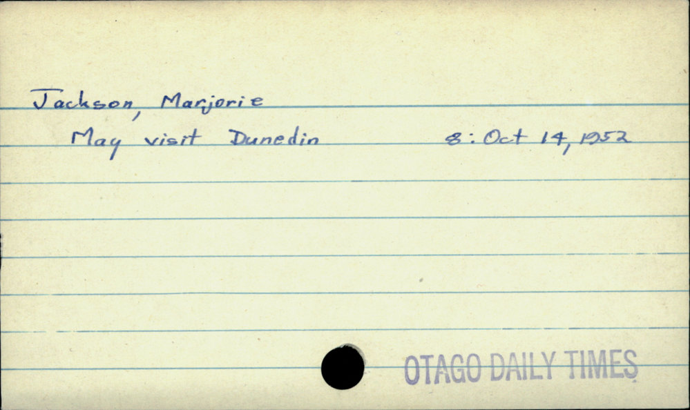 Dunedin Public Libraries (9th Jul 2020). Jackson, Marjorie. In Website Dunedin Public Libraries. Retrieved 27th Mar 2026 07:13, from https://dunedin.recollect.co.nz/nodes/view/156309