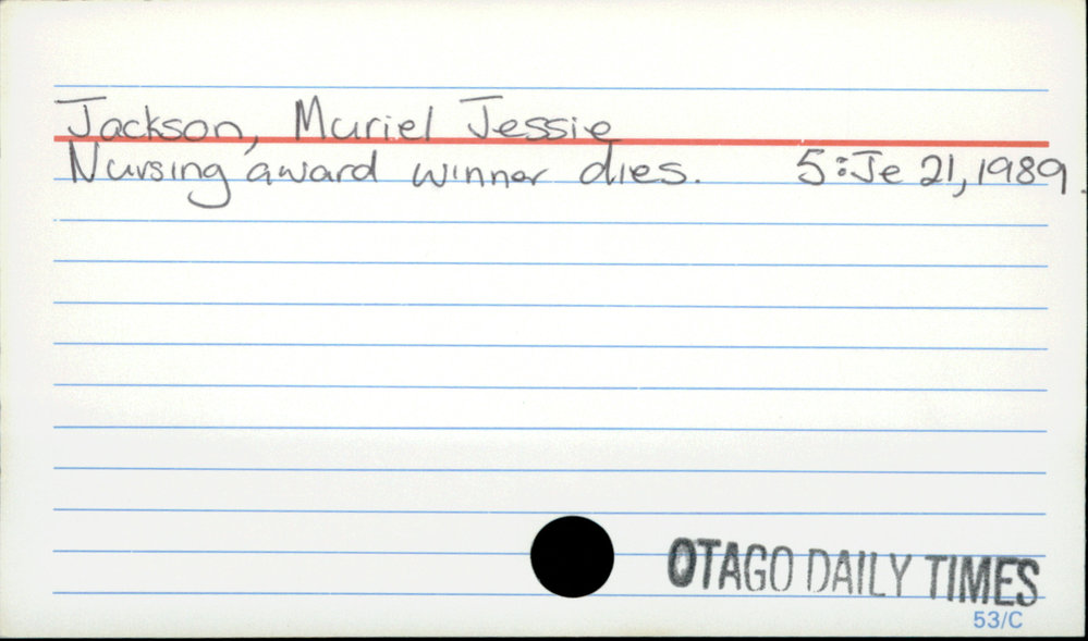 Dunedin Public Libraries (9th Jul 2020). Jackson, Muriel Jessie. In Website Dunedin Public Libraries. Retrieved 27th Mar 2026 07:15, from https://dunedin.recollect.co.nz/nodes/view/156317