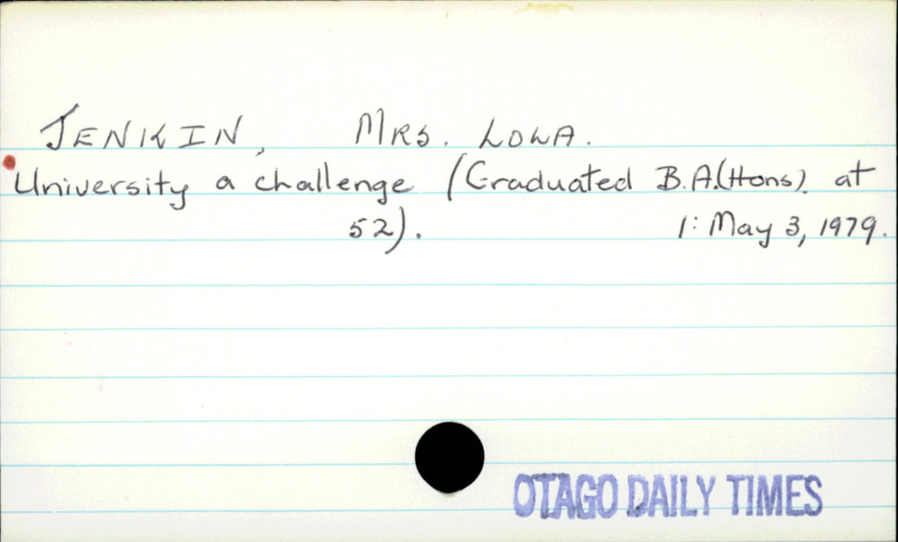 Dunedin Public Libraries (14th Jul 2020). JENKIN, MRS. LOLA. In Website Dunedin Public Libraries. Retrieved 27th Mar 2026 07:02, from https://dunedin.recollect.co.nz/nodes/view/157076