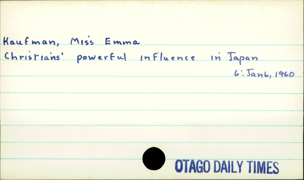 Dunedin Public Libraries (3rd Aug 2020). Kaufman, Miss Emma. In Website Dunedin Public Libraries. Retrieved 27th Mar 2026 07:01, from https://dunedin.recollect.co.nz/nodes/view/159253