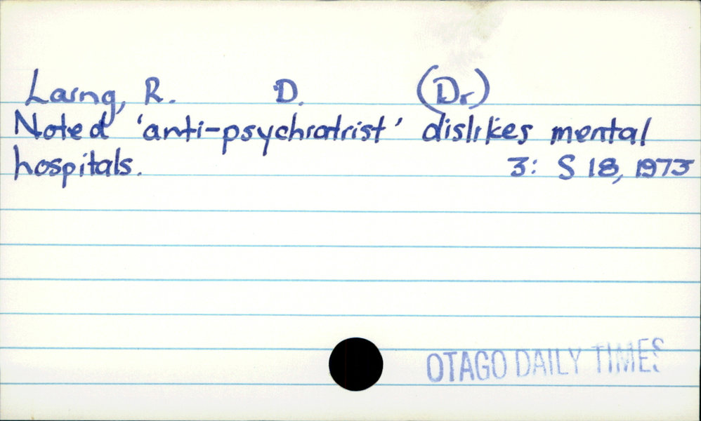 Dunedin Public Libraries (7th Sep 2020). Laing, R.D. (Dr). In Website Dunedin Public Libraries. Retrieved 27th Mar 2026 10:35, from https://dunedin.recollect.co.nz/nodes/view/162411