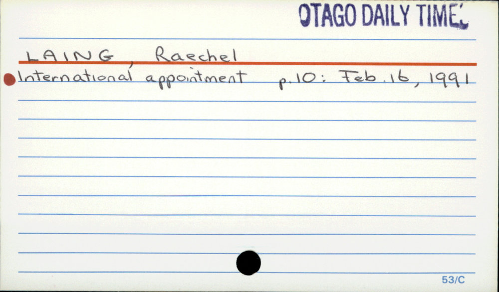 Dunedin Public Libraries (7th Sep 2020). Laing, Raechel. In Website Dunedin Public Libraries. Retrieved 27th Mar 2026 10:35, from https://dunedin.recollect.co.nz/nodes/view/162413