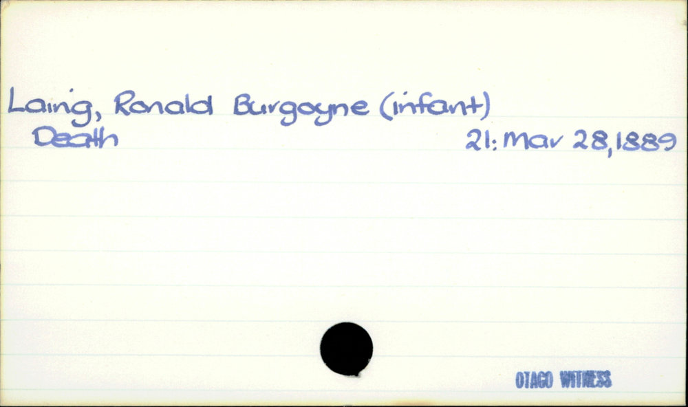 Dunedin Public Libraries (7th Sep 2020). Laing, Ronald Burgoyne (infant). In Website Dunedin Public Libraries. Retrieved 27th Mar 2026 10:35, from https://dunedin.recollect.co.nz/nodes/view/162414
