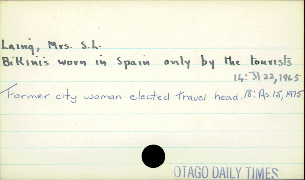 Dunedin Public Libraries (7th Sep 2020). Laing, Mrs S.L.. In Website Dunedin Public Libraries. Retrieved 27th Mar 2026 10:35, from https://dunedin.recollect.co.nz/nodes/view/162419