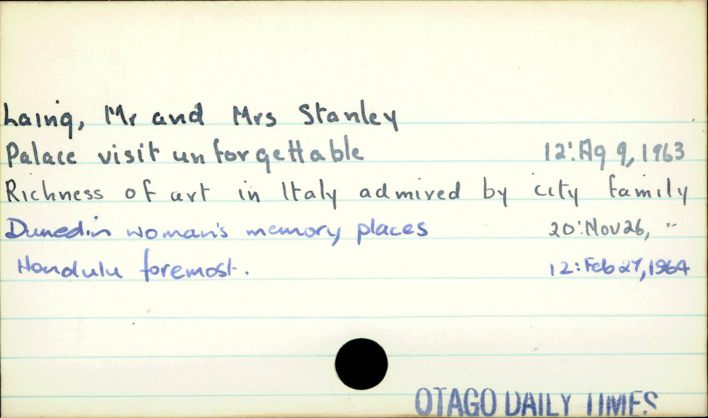 Dunedin Public Libraries (8th Sep 2020). Laing, Mr and Mrs Stanley. In Website Dunedin Public Libraries. Retrieved 27th Mar 2026 10:33, from https://dunedin.recollect.co.nz/nodes/view/162420