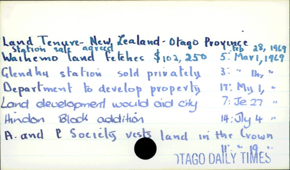Dunedin Public Libraries (22nd Sep 2020). Land Tenure - New Zealand - Otago Province. In Website Dunedin Public Libraries. Retrieved 27th Mar 2026 07:04, from https://dunedin.recollect.co.nz/nodes/view/163140