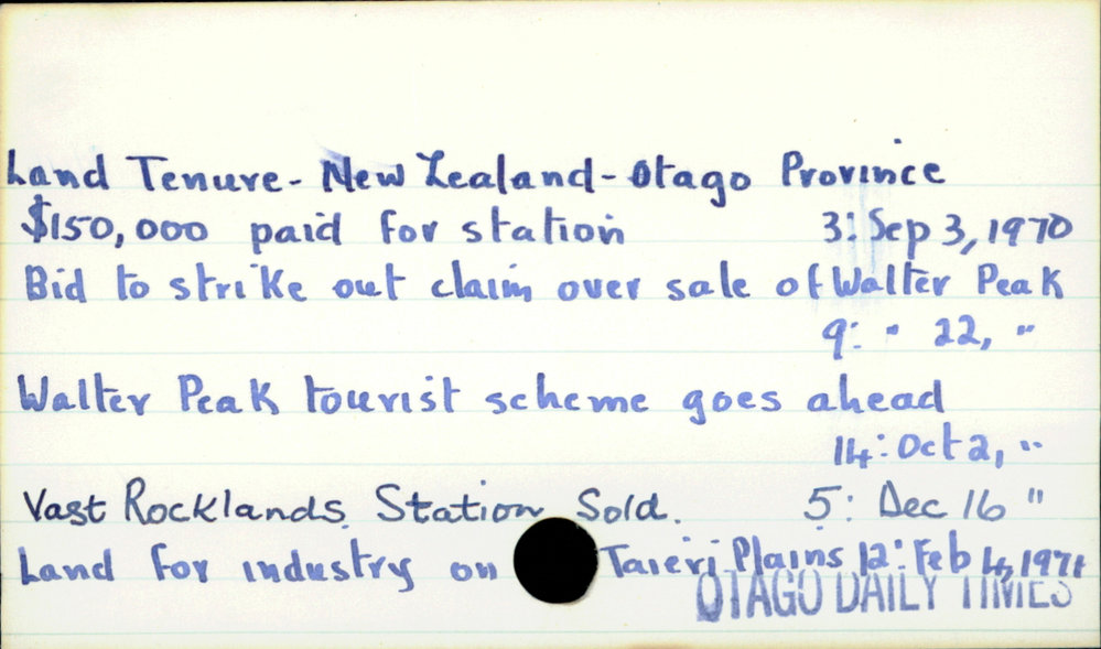 Dunedin Public Libraries (22nd Sep 2020). Land Tenure - New Zealand - Otago Province. In Website Dunedin Public Libraries. Retrieved 27th Mar 2026 07:10, from https://dunedin.recollect.co.nz/nodes/view/163144