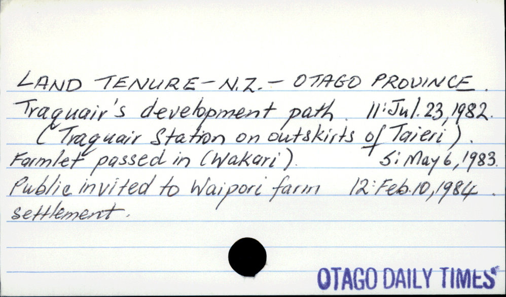 Dunedin Public Libraries (23rd Sep 2020). Land Tenure - New Zealand - Otago Province. In Website Dunedin Public Libraries. Retrieved 27th Mar 2026 07:10, from https://dunedin.recollect.co.nz/nodes/view/163156