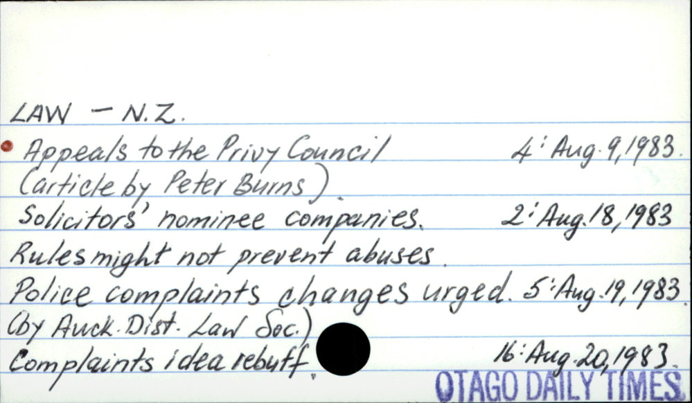 Dunedin Public Libraries (5th Oct 2020). Law - N.Z.. In Website Dunedin Public Libraries. Retrieved 27th Mar 2026 07:12, from https://dunedin.recollect.co.nz/nodes/view/163886
