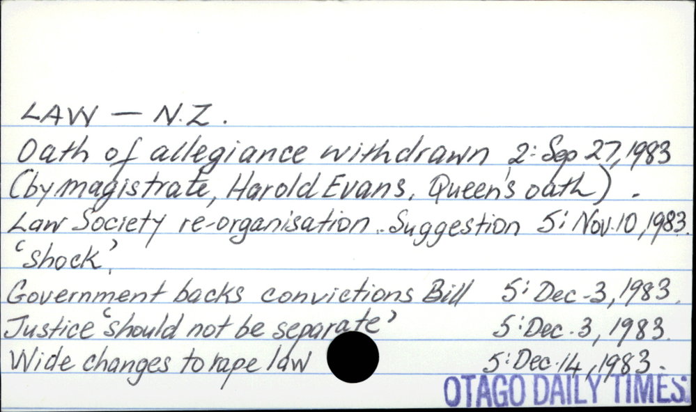 Dunedin Public Libraries (4th Oct 2020). Law - New Zealand. In Website Dunedin Public Libraries. Retrieved 27th Mar 2026 07:14, from https://dunedin.recollect.co.nz/nodes/view/163888