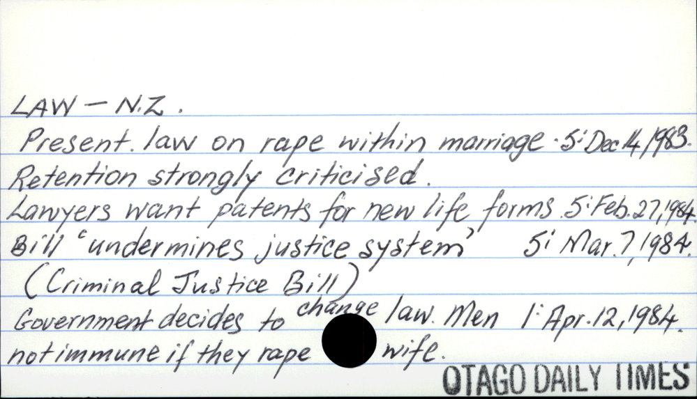Dunedin Public Libraries (8th Oct 2020). Law - New Zealand. In Website Dunedin Public Libraries. Retrieved 27th Mar 2026 07:12, from https://dunedin.recollect.co.nz/nodes/view/163889