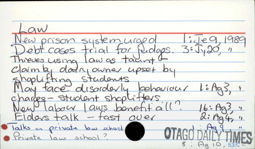 Dunedin Public Libraries (8th Oct 2020). Law. In Website Dunedin Public Libraries. Retrieved 27th Mar 2026 07:12, from https://dunedin.recollect.co.nz/nodes/view/163903